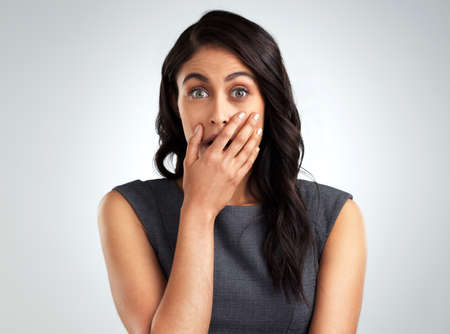 I just dont have the words. Studio portrait of an attractive young woman looking shocked against a grey background.