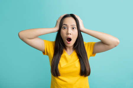 Shocked scared young asian woman in casual clothes standing over blue wall background, covers face with hands