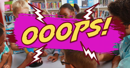 Seven children pressing buzzer on white table in school library, with comic OOPS overlay. Collaboration, education, playful, vibrant, teamwork, learning, youth