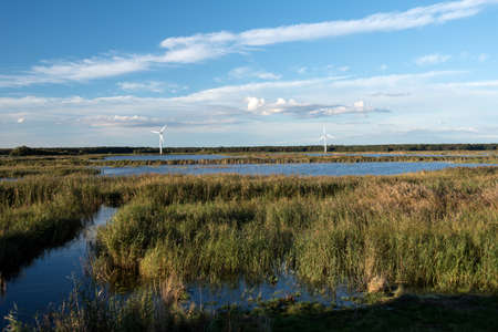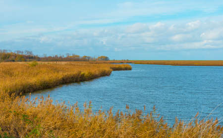 View over the wetland in natural park and protected area with yellow reed, water and blue sky in Lauwersmeer, The Netherlands
