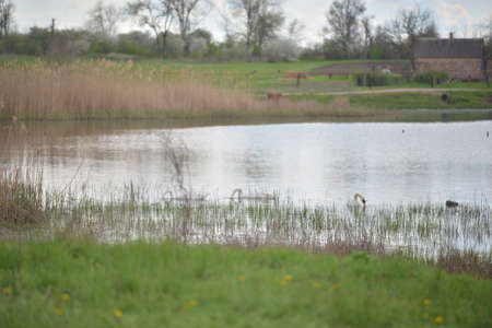 white swans in a pond, against the backdrop of a rural landscape.