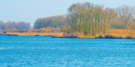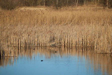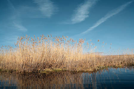 Reed along the edge of a lake in wetland in bright blue sunlight in spring, Almere, Flevoland, The Netherlands, March 24, 2021