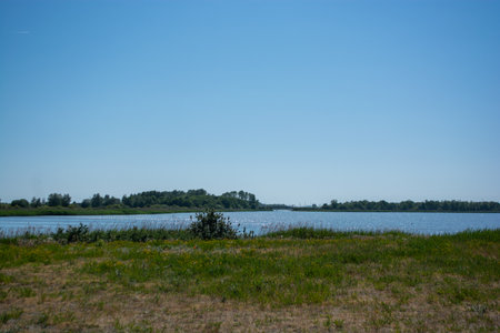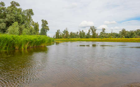 The edge of a lake in a green windy wetland in bright sunlight under a blue white csky in autumn, Almere, Flevoland, The Netherlands