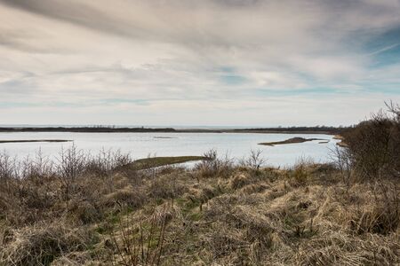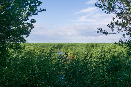 vast tidal marsh on baltic sea coast with reed beds in the foreground