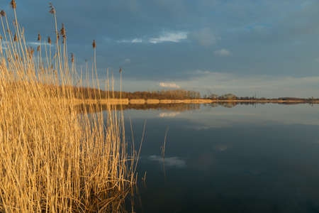 High dry reeds growing in a calm lake, evening dark clouds on the sky