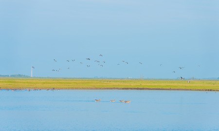 Schakerloopolder in tholen with many birds and rural buildings, countryside of Zeeland, the netherlands