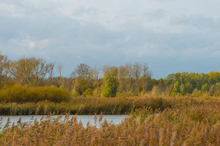 Reed along the edge of a lake in wetland in bright sunlight in autumn, Almere, Flevoland, The Netherlands, November 4, 2020