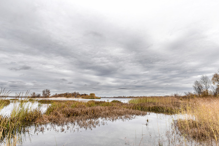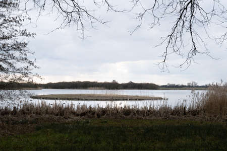 A Small island in a lake with reedlands and a cloudy sky in the vicinity of Amerongen The Netherlands