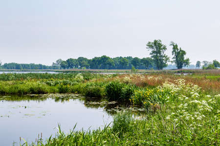 Landscape nature reserve De Onlanden with pond and wild blooming flowers near Groningen city The Netherlands