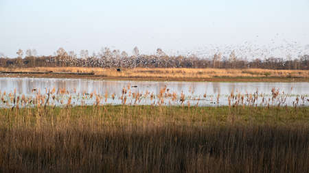 Population of wild geese at scenic Guelper See (Havelaue) in Brandenburg, Germany at sunset
