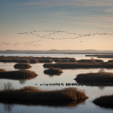 A flock of geese flying over the Danube Delta, Romania