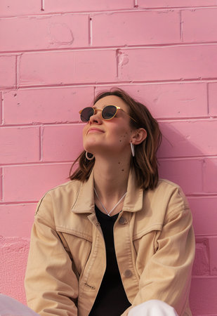 A young woman is leaning back with a content expression on her face, basking in the warmth of the sun.