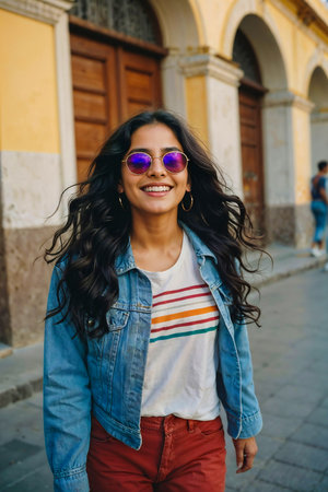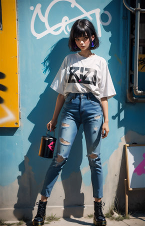 Stylish young woman wearing a casual yet fashionable outfit, standing confidently outdoors. She exudes confidence and independence, with bold makeup and a casual urban backdrop.