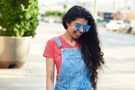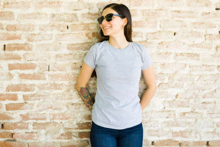 Attractive fashionable woman with trendy sunglasses and a beautiful print design on a t-shirt