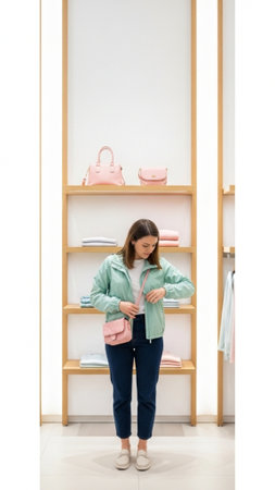 A striking vertical full body editorial photograph capturing a woman centered in a modern boutique,