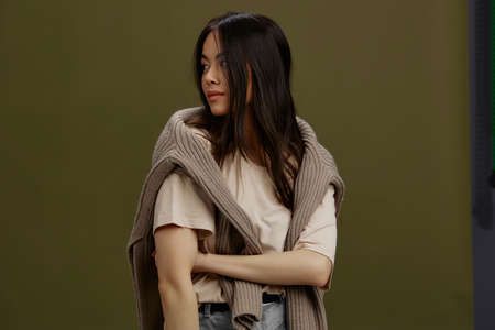 Beautiful stylish woman in fashionable clothes look in a beige Down-padded coat jacket, a knitted vintage Pullover and blue classic jeans stands near a wooden wall.