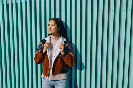 Woman poses casually against a blue wall, showcasing street fashion and confidence in an outdoor moment with stylish textures and relaxed stance