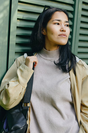Woman, thoughtful and street style, stands near green shutters wearing a casual coat and soft knit sweater, carrying a bag, reflecting on daily life and urban fashion, captured in natural light with