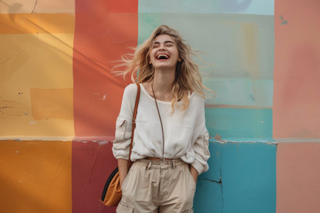 A woman is smiling and holding a purse while standing in front of a colorful wall. Scene is cheerful and lighthearted