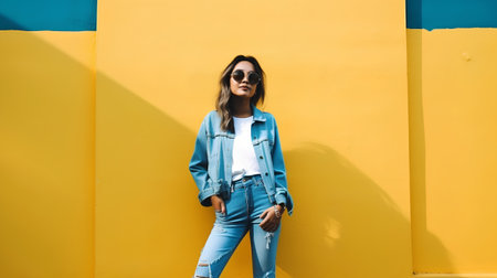 A young woman models a casual style with a yellow jacket and denim jeans during a stylish photo session in an urban environment. Natural light highlights her confident expression.