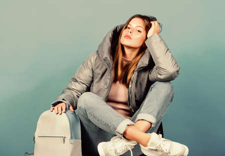 thoughtful mood. woman in beanie hat with backpack. warm winter clothing. shopping. flu and cold season. Leather bag fashion. girl in puffed coat. faux fur fashion. happy winter holidays