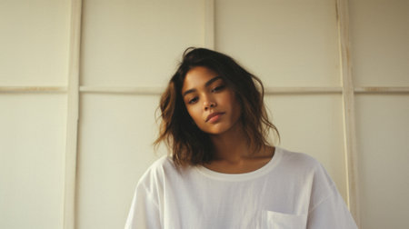 Young pretty cool Indian woman model wearing tshirt looking at camera standing on color background. Face skin care cosmetics makeup, fashion ads. Beauty portrait. White t-shirt mock up template.
