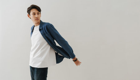 Asian boy wearing shirt posing and looking aside isolated over white background