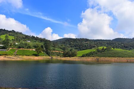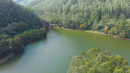 Aerial view beautiful nature with mountains and hills by Lake Mattupetty. Kerala State. Near the city of Munar.