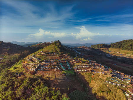 Top view aerial photo from flying drone of Doi Mon Jam Camping Tent Tourist attractions in Mae Rim District Chiangmai Province Thailand