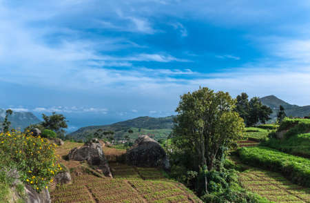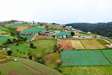 Nilgiri Hills, India - October 26, 2013: Near Thalaikunha hamlet, small farms and green and brown vegetable plots under blue sky. Highland scenery with mountains, dark green forests, colorful houses