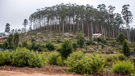 Overcast landscape of tall tree plantation on a hillside with a small cabin and scattered shrubs