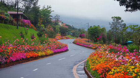 Vibrant floral pathway a stunning road adorned with colorful blossoms on either side