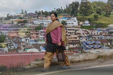 Coonoor, India - October 30, 2015 - Woman in front of slum in Coonor, Nilgri Mountains