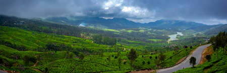 Tea plantation mountain landscape with roads and houses. Photo shoted in Munnar, India
