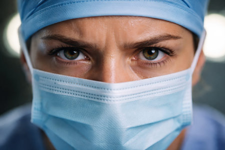 A medical professional displays a serious expression while wearing a mask in a surgical setting, emphasizing concentration and readiness for surgery.