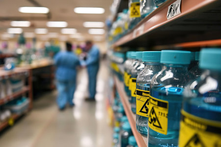 A close-up of labeled prescription medicine bottles lined up on a shelf inside a well-lit pharmacy.