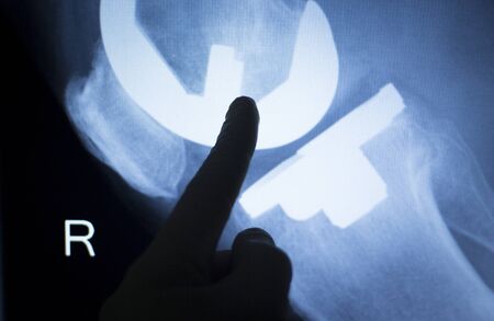 Knee and meniscus injury medical x-ray test scan result for adult showing orthopedic Traumatology titanium metal plate implant image.