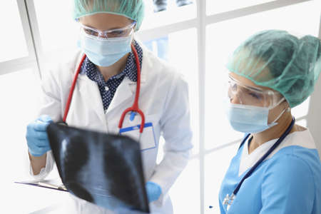 Two doctor in suits, medical gloves and protective masks hold X-ray photograph. Two women study results of internal examinations.