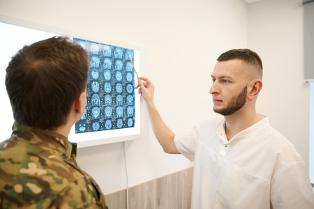Doctor interpreting magnetic resonance imaging results of head to serviceperson