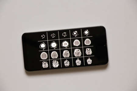 3D computed tomography of the brain with a fracture of the frontal part of the skull after injury on phone screens, mobile application