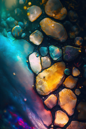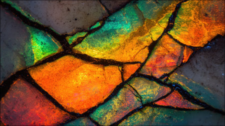 This vivid abstract image showcases a stunning cracked rock surface with vibrant iridescent colors. Perfect for artistic projects and backgrounds.