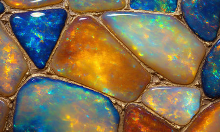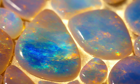 Beautifully polished opal stones displaying stunning colors and intricate golden veins under gentle illumination.