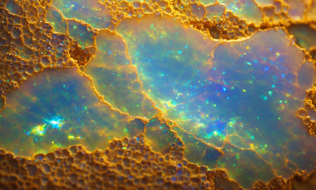 Macro shot of a vivid multicolored gemstone slice with iridescent crystal patterns and rough gold-edged borders. Abstract natural mineral texture.
