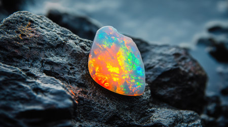 This captivating image showcases a beautiful opal gemstone with vibrant colors and unique patterns, resting on a textured dark rock surface by water. Perfect for nature lovers.