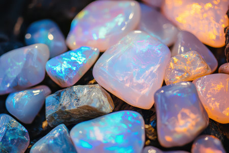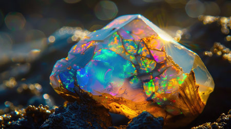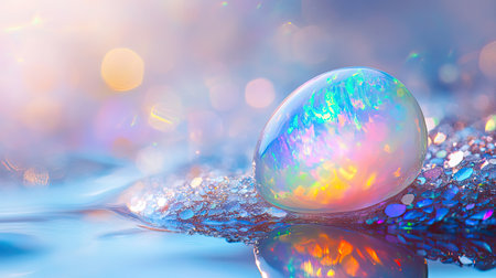 A mesmerizing close-up of a colorful opal gemstone resting on a sparkling surface, accentuated by soft bokeh lights in pastel tones.