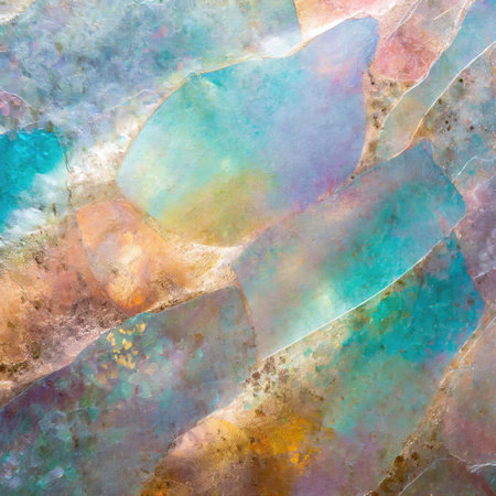 This artwork displays a stunning pastel marble surface with intricate textures and shimmering iridescent patterns. The harmonious hues blend elegantly, highlighting the marble unique qualities through beautifully arranged natural stone fragments