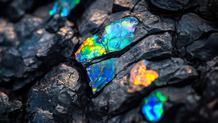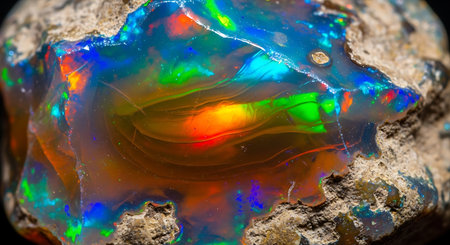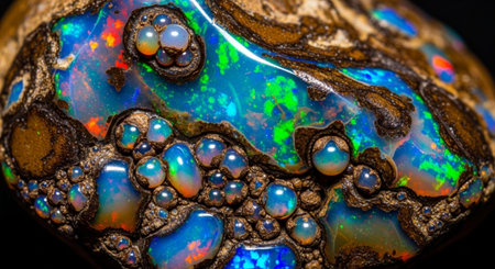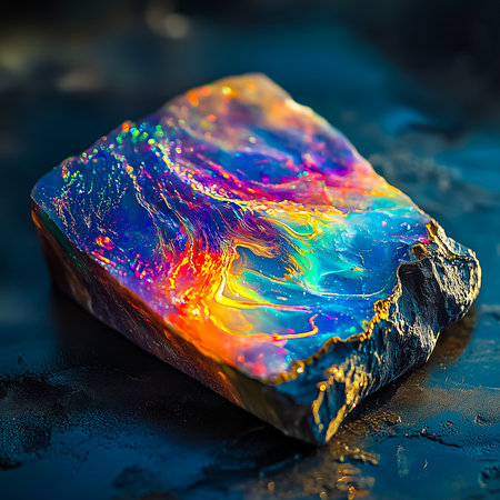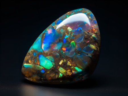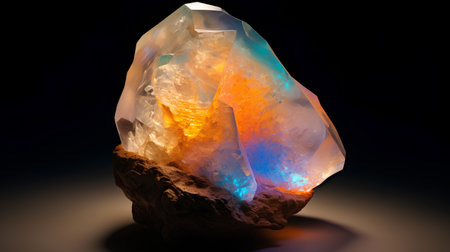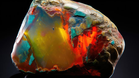 A stunning opal stone showcases a spectrum of vibrant colors reflecting on a dark surface, creating a captivating and artistic imagery perfect for various creative projects.
