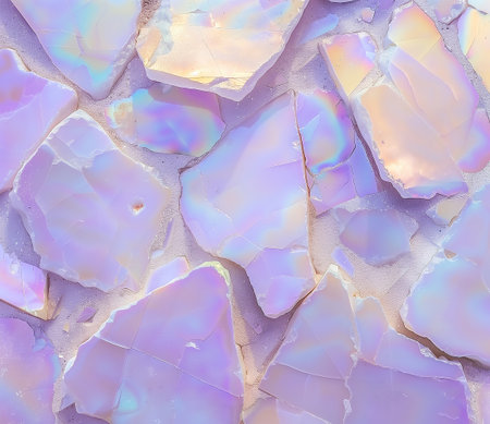 A stunning display of iridescent marble pieces features a mix of pastel colors, mainly purple and soft pink. The textured surface reflects light, producing a shimmering effect that highlights the stone's natural beauty. Each uniquely shaped fragment adds depth and intrigue
