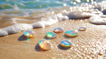A stunning display of colorful shells rests on a sandy beach, glistening under sunlight while gentle waves lap the shore, creating a serene ocean scene.