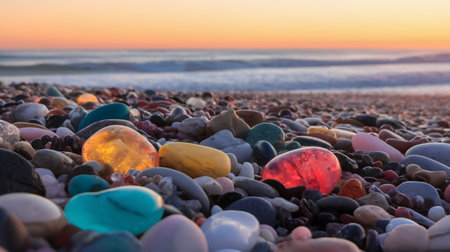 Colorful pebbles on the beach during sunset, creating a serene and vibrant scene.